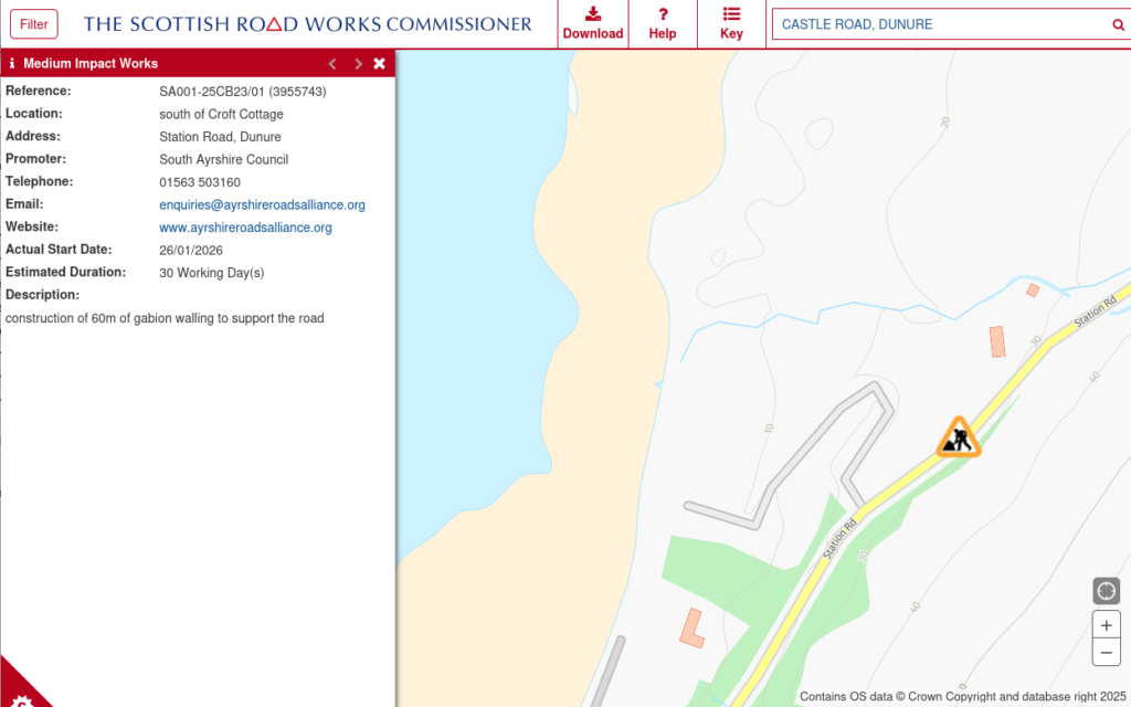 The link to the notification from the Scottish Road Works Commissioner is here (you will need to type in the road name and village).